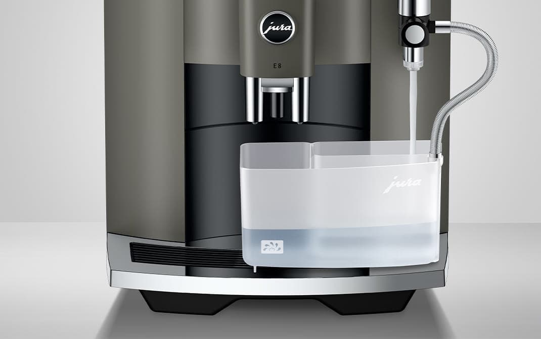 Den gjennomtenkte rengjøringen av melkesystemet skjer automatisk med ett tastetrykk, og er unnagjort i en fei. Restvannsskålen har en optimal ergonomi. Den er utformet slik at vannet ikke flommer over, og kan enkelt tas ut med bare én hånd.