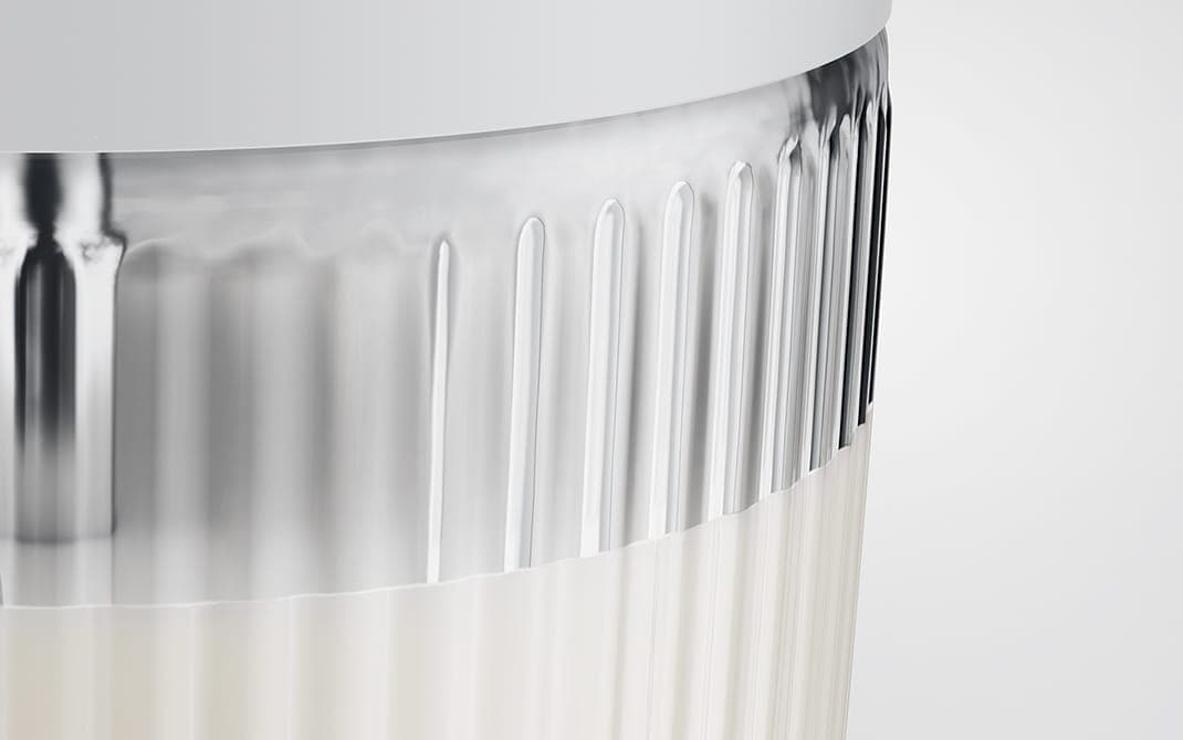 Melkekaraffelen er produsert i borosilikatglass, noe som gjør at den tåler temperatursvingninger og ikke er lett å ripe. Den tåler rengjøring i oppvaskmaskin, beskytter melken og melkealternativet mot lukt og holder dem ferske. Takket være den tykke bunnen står karaffelen stabilt og trygt, og den riflete overflatestrukturen gir den et elegant utseende.